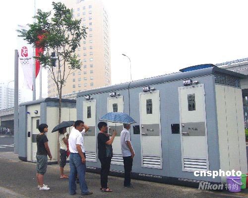 7月8日,在北京“鳥巢”東側便道上,一排為奧運準備的公廁開始供人們使用,過往游客紛紛排隊體驗"方便"。 中新社發(fā) 玉龍 攝