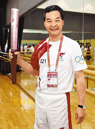 但“我跑完后,那把火炬還未曾返過我寫字樓”,原來梁振英借出奧運(yùn)火炬及火炬手制服,給一所學(xué)校拍照留念并捐款賑災(zāi)后,家長教師會見狀亦趕忙向他商轉(zhuǎn)借展覽,故火炬兜兜轉(zhuǎn)轉(zhuǎn),直到9日才送回他的辦公室。