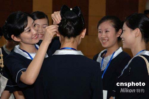 參加北京奧運會頒獎儀式的專業(yè)志愿者正在互相整理發(fā)型。中新社發(fā) 王東明 攝