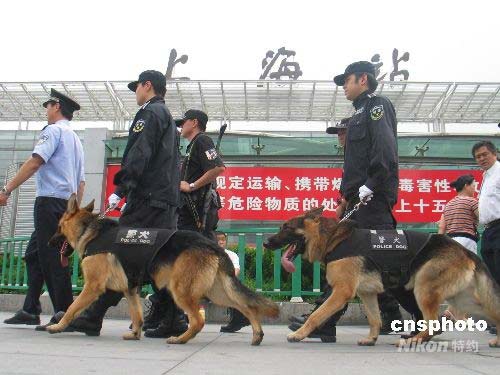 為了提高鐵路安保等級,確保奧運期間鐵路運輸和旅途安全,從7月24日起,鐵路警方抽調特警小分隊進駐上海站廣場,攜警犬晝夜巡邏。中新社發(fā) 陳煥聯 攝