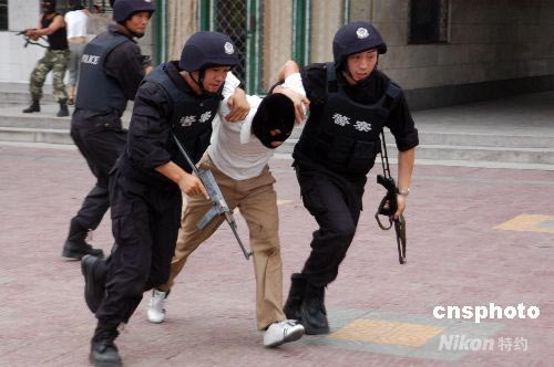 7月14日,安徽省亳州市警方舉行“2008利劍行動(dòng)”奧運(yùn)安保反恐演練,公安、武警、消防各警種密切配合,上百名特警隊(duì)員進(jìn)行了解救人質(zhì)等課目的實(shí)戰(zhàn)演練,充分顯示了已全面做好奧運(yùn)防范和處置各類恐怖襲擊事件的準(zhǔn)備。圖為安徽亳州警方特警隊(duì)員在反恐演練中。 中新社發(fā) 張延林 攝