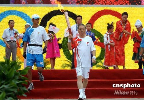 7月15日,奧運火炬在吉林松原傳遞,火炬手李述跑出首棒火炬。中新社發(fā) 廖攀 攝