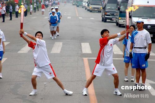7月15日,奧運(yùn)火炬在吉林松原傳遞;鹁媸智f(wàn)日(右)、張世民以優(yōu)美姿態(tài)交接火炬。中新社發(fā) 廖攀 攝