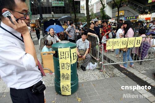 中銀香港發(fā)行奧運紀念鈔掀起全城狂熱。連日來數(shù)千計市民冒“黃色暴雨”排隊輪候,發(fā)售奧運紀念鈔票的各分行滿是擁擠的人龍。七月十五日下午,中銀香港尖沙咀分行向通宵排隊的市民作登記。 中新社發(fā) 洪少葵 攝