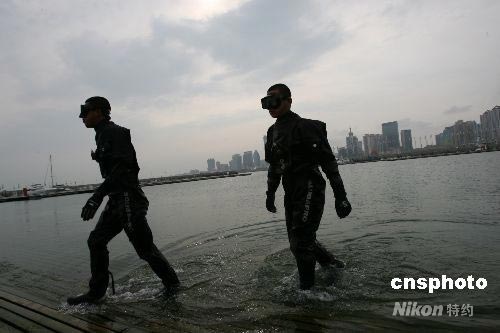 青島邊防支隊駐奧帆中心的特勤官兵暑期在奧運(yùn)會帆船比賽場地進(jìn)行適應(yīng)性潛水訓(xùn)練,在貼近實戰(zhàn)狀態(tài)下提高隊員處置突發(fā)事件等能力。第29屆奧運(yùn)會帆船帆板比賽將于2008年8月9日至23日在青島國際帆船中心及周邊水域舉行。中新社發(fā) 王瑤 攝