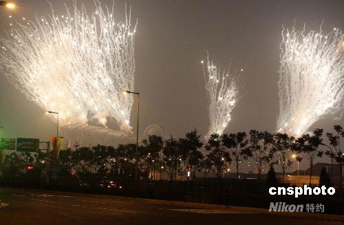 7月16日晚,北京奧運(yùn)會開幕式彩排首次燃放禮花,鳥巢上空絢爛多彩。中新社發(fā) 吳芒子 攝