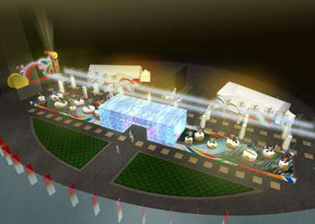 廣場內(nèi)最受矚目的,是聳立于鐘樓前的半透明迷你“水立方”模型,晚上配合藍(lán)色燈光,將水立方的晶瑩剔透表露無遺,市民可以穿過水立方作近距離接觸,而奧運(yùn)吉祥物福娃會(huì)站立于水立方側(cè)。每晚8點(diǎn)半至10點(diǎn),每隔半小時(shí)水立方將加插燈光匯演,在奧運(yùn)主題音樂“We are ready”音效下,呈現(xiàn)千變?nèi)f化的燈光效果。