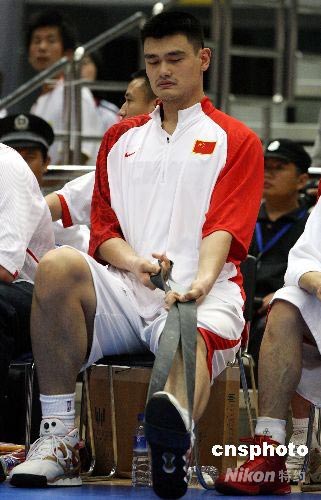 圖為姚明在比賽間訓(xùn)練負(fù)傷的左腳。中新社發(fā) 任晨鳴 攝