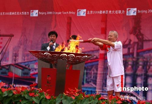 7月18日上午,北京奧運火炬圓滿結(jié)束了在“鋼城”遼寧鞍山的傳遞。圖為最后一棒火炬手聞寶滿點燃圣火盆。 中新社發(fā) 周兆軍 攝