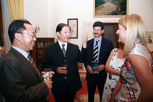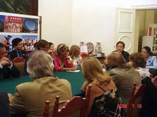 意大利媒體記者對孫玉璽大使在他們赴京采訪奧運前邀請大家出席北京奧運會倒計時20天的慶;顒颖硎靖兄x,祝愿北京奧運取得圓滿成功,并表示將努力投入奧運報道工作,增進意民眾對北京奧運和今日中國的了解。(博源)