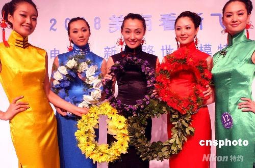 7月20日,2008美麗看新飛--新絲路世界模特大賽中國區(qū)總決賽在遼寧大連啤酒節(jié)上舉行,是次賽事經(jīng)過在中國5大城市巡演后的最后一站。15名中國賽區(qū)職業(yè)選手參加了5大城市巡演選拔,最后角逐出了10名最佳模特參加10月在北京舉行的新絲路世界模特大賽國際總決賽。圖為參賽模特選手身穿五色旗袍展示五環(huán)奧運(yùn)風(fēng)采。 中新社發(fā) 錢興強(qiáng) 攝