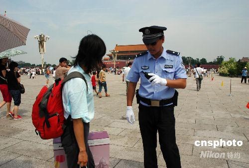 近日,奧運(yùn)臨近,天安門廣場民警對游客攜帶物品檢查越來越嚴(yán)格。圖為巡邏的民警正在盤查游客包裹,以保障奧運(yùn)會順利進(jìn)行。中新社發(fā) 張雙雙 攝