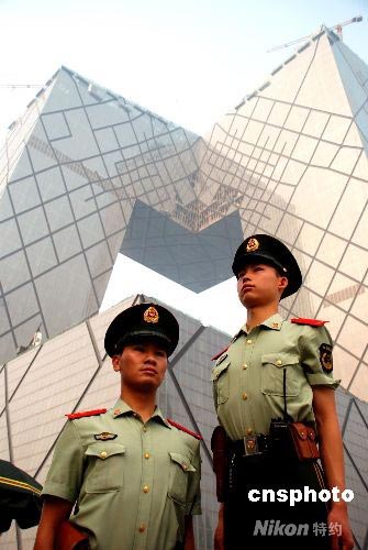 7月23日,北京武警正式進(jìn)駐中央電視臺(tái)新址,開始擔(dān)負(fù)中央電視臺(tái)的安全保衛(wèi)任務(wù)。奧運(yùn)電視報(bào)道新聞中心近日將在中央電視臺(tái)新址開始啟用。中新社發(fā) 楊慧峰 攝