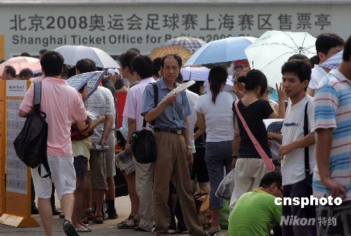 7月25日,北京奧運會足球比賽上海賽區(qū)門票開始發(fā)售,眾多球迷通宵排隊等候爭購奧運門票。據(jù)悉,此次發(fā)售的是上海賽區(qū)所剩余的164737張門票,其中包括男足第3、4名決賽在內(nèi)的9個場次的門票。價格最便宜的小組賽門票只需要40元,最高為男足第3、4名決賽A票,價格為800元。 中新社發(fā) 湯彥俊 攝