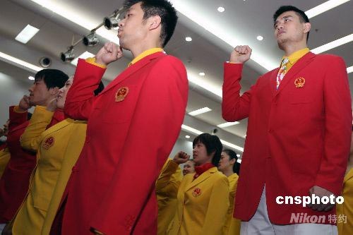 姚明、劉翔、朱啟南等面對國旗莊嚴(yán)宣誓。 中新社發(fā) 任晨鳴 攝