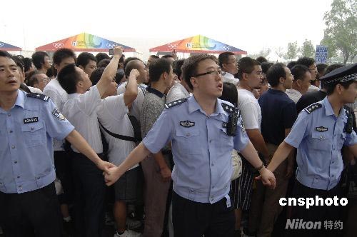 7月25日上午9時,第4階段奧運門票銷售正式開始,近百名奧運安保人員在北京五棵松籃球體育館外現(xiàn)場指揮數(shù)千球迷有序購票。中新社發(fā) 徐曦弋 攝