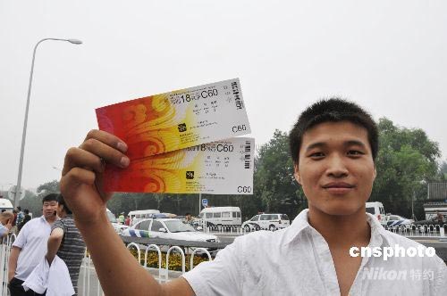 7月25日,第4階段最后82萬張北京奧運(yùn)會(huì)比賽門票向公眾發(fā)售,銷售異;鸨T缟7點(diǎn),銷售現(xiàn)場(chǎng)除了近2萬人在守侯排隊(duì)外,在排隊(duì)區(qū)域外,也有近萬人正在焦急等候進(jìn)入排隊(duì)區(qū)。圖為一位來自河南的張先生向記者展示剛買到的兩張奧運(yùn)門票。張先生說,他特地從河南趕過來,等了24個(gè)小時(shí)才買到票。中新社發(fā) 王宇婷 攝