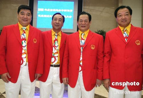 7月25日,參加北京奧運(yùn)會的中國體育代表團(tuán)正式成立,代表團(tuán)總?cè)藬?shù)共1099人,639名運(yùn)動員將參加北京奧運(yùn)會28個大項(xiàng),38個分項(xiàng)的全部比賽。其中,國家射擊隊(duì)現(xiàn)任總教練王義夫、體操管理中心主任高健、舉摔柔運(yùn)動管理中心主任馬文廣、中國首枚奧運(yùn)會金牌獲得者許海峰(從左至右)是代表團(tuán)中參加過七屆奧運(yùn)會的四大“七朝元老”。 中新社發(fā) 任晨鳴 攝