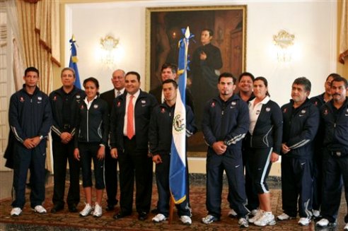 薩爾瓦多總統(tǒng)埃利亞斯-安東尼奧-薩卡28日向該國參加北京奧運(yùn)會(huì)的運(yùn)動(dòng)員代表授予國旗。