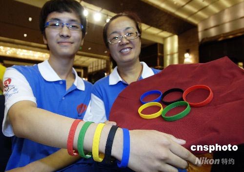 7月30日,北京奧運(yùn)會志愿者恭杰克與其母親共同展示“微笑圈”家庭版。當(dāng)日,由奧運(yùn)五環(huán)顏色組成的奧運(yùn)“微笑圈”家庭版在北京正式發(fā)布,其內(nèi)外側(cè)統(tǒng)一印有北京奧運(yùn)會、殘奧會標(biāo)志,主要面向志愿者家庭發(fā)放。中新社發(fā) 王東明 攝