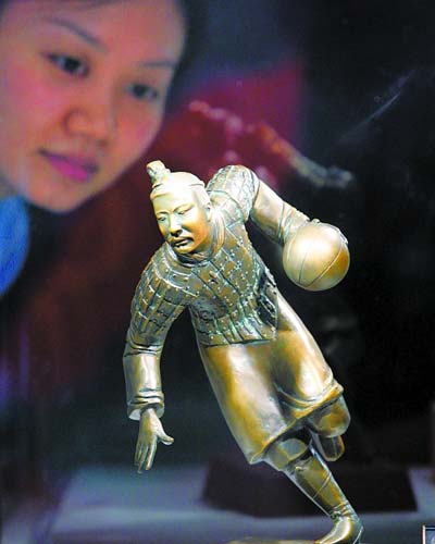 古老的兵馬俑練起了體操,踢起了足球。奧運(yùn)臨近,北京商家競(jìng)相開發(fā)各類具有中國(guó)特色的禮品,迎接各國(guó)來賓。限量100套的兵馬俑青銅運(yùn)動(dòng)雕塑在燕莎商城亮相,這是由一位年輕的雕塑師專門為奧運(yùn)“創(chuàng)意”的新作。 (記者 竇紅梅 戴冰攝)