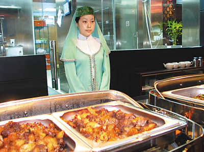 考慮到穆斯林的習(xí)俗,在餐廳旁邊還專門設(shè)立了禮拜室,每天都有來自清真寺的阿訇來帶領(lǐng)做禮拜。