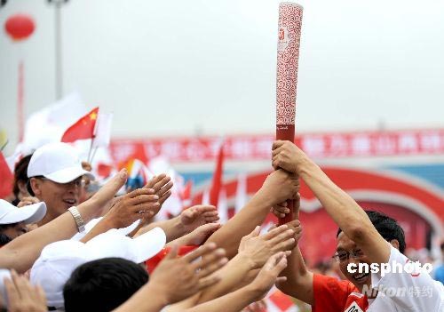 7月31日,奧運(yùn)火炬在河北唐山傳遞,在傳遞過(guò)程中,唐山民眾同火炬手熱捧“祥云”火炬。中新社發(fā) 廖攀 攝