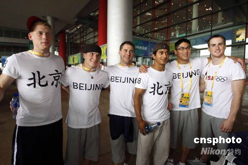 7月31日,美國男子體操隊飛抵北京,在北京首都國際機場T3航站樓前身著印有“北京”字樣的T恤衫合影。右一為摩根·哈姆,右二為華裔體操選手譚凱文(Kevin Tan)。 中新社發(fā) 杜洋 攝