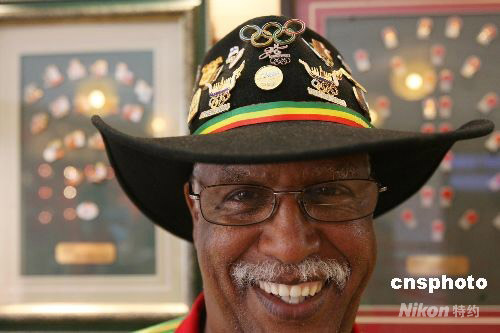 7月31日,參加過十屆奧運會的Aberra D Aguegnehu在北京奧運村展示他的帽子和奧運紀念章。Aberra D Aguegnehu是國際奧委會語言志愿者,懂十五種語言,能流利說七種語言。