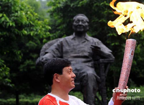 8月3日,奧運(yùn)圣火在四川廣安傳遞,牌坊村村民李良國(guó)在鄧小平銅像前傳遞奧運(yùn)火炬。