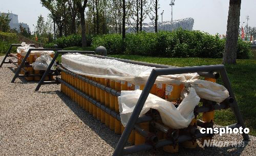 8月3日,離北京奧運(yùn)會(huì)開幕還有5天,國家主體育場——“鳥巢”建筑附近做好了北京奧運(yùn)會(huì)開幕式的準(zhǔn)備工作。圖為鳥巢北側(cè)布置22x4聯(lián)發(fā)禮花炮放射裝置,每一個(gè)發(fā)射裝置上均有禮花彈詳細(xì)名稱。 中新社發(fā) 鄒憲 攝