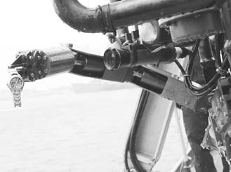 安裝在救生船后甲板的“水下機(jī)器人”通過專用吊車迅速潛入海中;遙控方艙內(nèi),士官廉法響、李明根據(jù)指令,嫻熟地操縱著遙控手柄,“水下機(jī)器人”在水中靈活機(jī)敏地游動(dòng)搜尋開去。由于海底淤泥較深,加上“水下機(jī)器人”在海底的旋轉(zhuǎn)作業(yè),很快把海水?dāng)嚨脺啙岵磺。遙控人員迅即采用原地微調(diào)的辦法,操縱“水下機(jī)器人”繼續(xù)搜索!八聶C(jī)器人發(fā)現(xiàn)可疑目標(biāo)!”短短幾分鐘后,遙控方艙內(nèi)傳出了令人振奮的消息。彩色顯示屏前,記者看到,“水下機(jī)器人”伸出“機(jī)械手”,非常靈活地完成了伸、開、抓、夾等各種動(dòng)作,牢牢地將可疑物———一只易拉罐握在了“手”中。也許是覺得打撈易拉罐的難度還不夠,有人又把一只手表扔進(jìn)了海中。“水下機(jī)器人”接到了出征命令,又一次潛入海底,利用自身攜帶的水下電視、圖像聲納,只用了不到15分鐘的時(shí)間就完成了探摸任務(wù)。