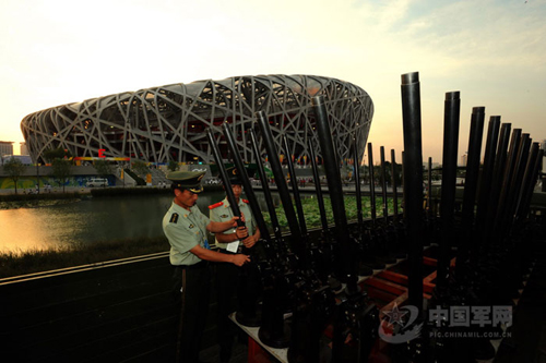 根據(jù)北京奧運會開幕式焰火施放方案,8月8日開幕式當(dāng)晚,從永定門經(jīng)過天安門廣場到國家體育場“鳥巢”的15公里中軸線上,共設(shè)立35個特效焰火施放陣地。中國將首次采用新型車載式禮花炮發(fā)射禮花,開奧運禮花炮車載發(fā)射先河。圖為負責(zé)奧運開幕式禮炮發(fā)射的武警官兵預(yù)演前檢驗禮炮狀態(tài)。馮凱旋 攝