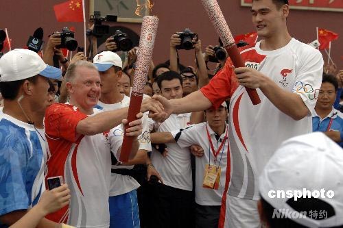 圖:維爾布魯根與姚明交接奧運(yùn)火炬