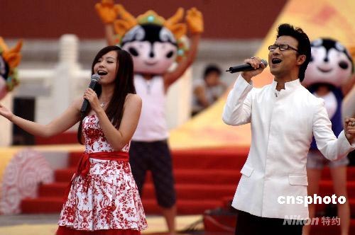 8月6日上午,奧運(yùn)火炬?zhèn)鬟f北京站從午門正式開始傳遞。圖為張靚穎、汪峰在傳遞現(xiàn)場放歌。中新社發(fā) 王東明 攝