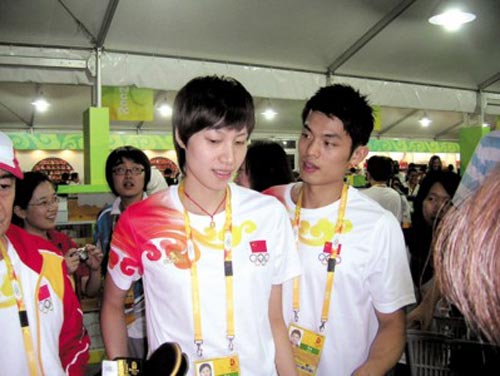 出門,兩人立刻就被“可口可樂交換紀(jì)念章”的店給吸引進(jìn)去了,結(jié)果兩人一人弄了一件免費(fèi)的環(huán)保T恤。一路上,圍觀拍照的人很多,林丹和謝杏芳很大方,不管是合影或者簽名,都來者不拒,而且絕對掛上微笑。看著羽毛球男女隊的領(lǐng)軍人物,在大賽前能有這樣的心情和心態(tài),真的很高興。對于記者的提問,林丹也不拒絕,但他說:“我現(xiàn)在不想說比賽的事兒,不過我的狀態(tài)非常好!弊∵M(jìn)了奧運(yùn)村,林丹說:“這里環(huán)境非常好,比雅典時候好。”而謝杏芳微微抱怨,“就是床小了點(diǎn)兒!