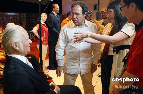 圖為國際奧林匹克博物館館長加貝特觀賞中國蠟像藝術(shù)作品。