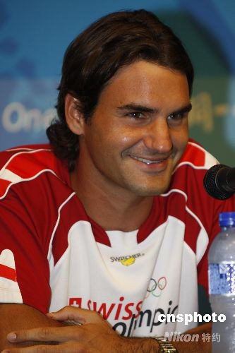 8月7日,瑞士網(wǎng)球天王羅杰·費德勒在北京奧運新聞中心召開發(fā)布會。費德勒將在8月8日開幕式當天度過自己27歲生日。 中新社發(fā) 杜洋 攝