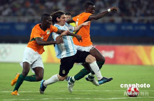 8月7日,北京奧運(yùn)會(huì)上海足球分賽場(chǎng)男足預(yù)賽,在衛(wèi)冕冠軍阿根廷對(duì)陣科特迪瓦的比賽中, 阿根廷以2:1取勝迎來(lái)開門紅,球星梅西(MESSI Lionel)為阿根廷攻入本屆奧足賽首粒進(jìn)球。圖為梅西帶球從人縫中突破。 中新社發(fā) 湯彥俊 攝