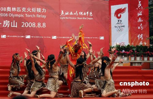 8月8日清晨,第29屆夏季奧運(yùn)會(huì)火炬,從周口店遺址出發(fā),開(kāi)啟最后一天的傳遞。圖為扮演遠(yuǎn)古時(shí)代北京人的男女演員以“原生態(tài)”的舞蹈歡迎奧運(yùn)火炬。中新社發(fā) 王東明 攝