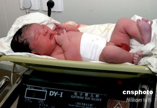圖為護士正為這名奧運男寶寶稱體重。中新社發(fā) 劉可耕 攝