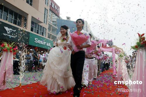 8月8日上午9時,江蘇邳州市十一對新人在市區(qū)最繁華的廣場,舉行集體婚禮,喜迎奧運。中新社發(fā) 劉向鴻 攝