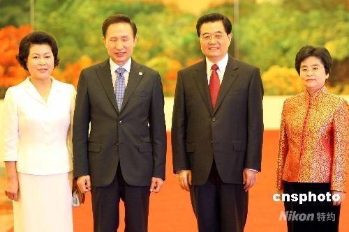 8月8日中午,中國(guó)國(guó)家主席胡錦濤和夫人劉永清在北京人民大會(huì)堂為出席北京奧運(yùn)會(huì)的貴賓舉行歡迎宴會(huì)。圖為胡錦濤夫婦歡迎韓國(guó)總統(tǒng)李明博夫婦。中新社發(fā) 任海霞 攝