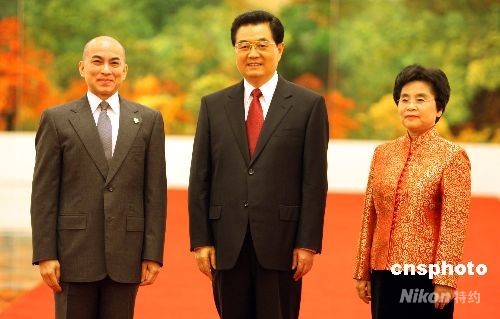 8月8日中午,中國國家主席胡錦濤和夫人劉永清在北京人民大會(huì)堂為出席北京奧運(yùn)會(huì)的貴賓舉行歡迎宴會(huì)。圖為胡錦濤夫婦歡迎柬埔寨國王西哈莫尼。中新社發(fā) 任海霞 攝