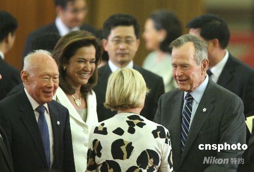 8月8日,中國國家主席胡錦濤在北京人民大會堂宴會廳為出席北京奧運會的貴賓舉行歡迎宴會。圖為新加坡內閣資政李光耀、美國前總統(tǒng)老布什出席北京奧運歡迎宴會。中新社發(fā) 廖文靜 攝