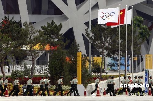 8月8日,第29屆夏季奧運會將于當晚在北京奧林匹克公園內的國家體育場開幕,武警跑向“鳥巢”周邊的警戒崗位。中新社發(fā) 杜洋 攝