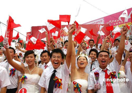 2008年8月8日,山東濱州50對(duì)新人齊聚廣場(chǎng),手舉奧運(yùn)旗幟高呼“中國加油、奧運(yùn)加油”,與祖國同慶,與奧運(yùn)同慶。中新社發(fā) 梁寶海 攝