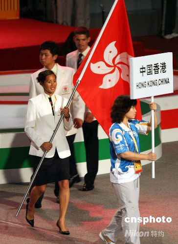 八月八日,香港特區(qū)政府在沙田賽場(chǎng)舉行盛大歡迎晚會(huì)上,歡迎來(lái)自世界各地參加奧運(yùn)馬術(shù)比賽的參賽隊(duì)伍。圖為香港隊(duì)入場(chǎng)。 中新社發(fā) 洪少葵 攝