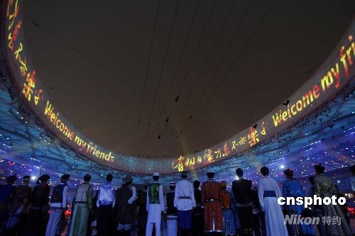 8月8日,第29屆夏季奧運(yùn)會(huì)在北京奧林匹克公園內(nèi)的國(guó)家體育場(chǎng)“鳥(niǎo)巢”舉行。圖為“有朋自遠(yuǎn)方來(lái),不亦悅乎”的銘言被投射在“鳥(niǎo)巢”上方。中新社發(fā) 杜洋 攝