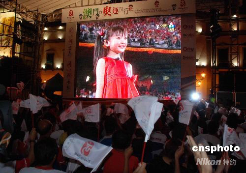 八月八日晚,澳門市民在議事亭前地通過大屏幕觀看北京奧運會開幕式,不時發(fā)出陣陣歡呼。 中新社發(fā) 畢永光 攝
